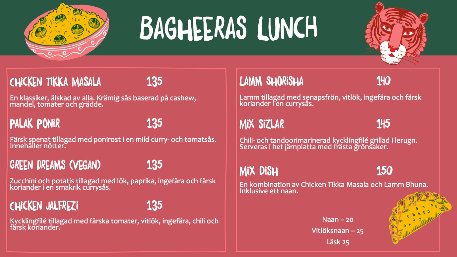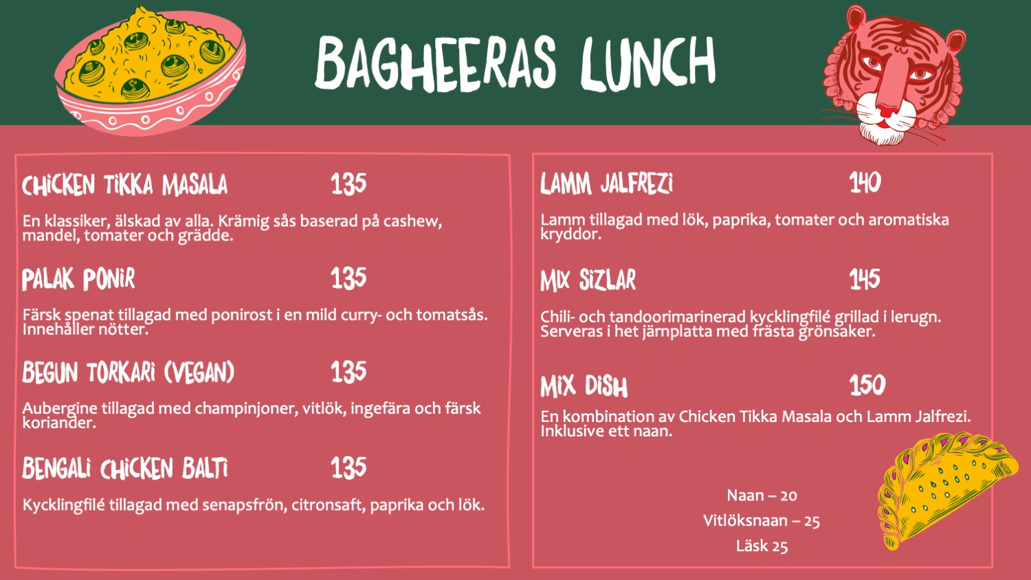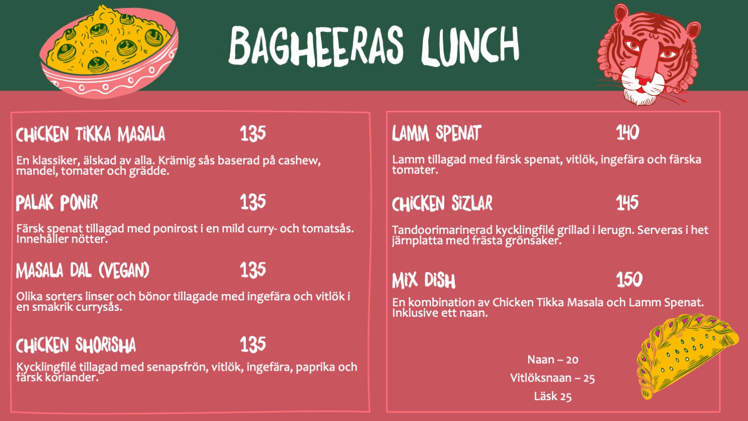 Hos Bagheeras vill vi ge dig en unik och minnesvärd gastronomisk upplevelse. Vårt kök förenar traditionella smaker med moderna kulinariska influenser, allt skapat för att väcka dina sinnen och din matglädje.